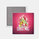 Un aimant avec un design graphique de Noël lumineux et festif. Le texte dit Joyeux Noël & Bonne Année. Conçu avec un monticule de cadeaux en forme d'arbre avec des flocons de neige festifs, des étoiles, des baubles de noël et des étincelles à l'air brillant. Aiguilles de pin et illustration en forme d'arbre également inclus dans cette image de vacances. L'arrière - plan est une couleur rose rougeâtre vibrante.