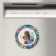 Célébrez un moment de famille préféré avec cet aimant photo ronde et lunatique, bleu marine, cadre motif fleur sauvage peint avec texte modifiable pour commémorer un événement spécial ou une personne.