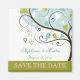 Cette personnalisation enregistrer la date magnet carré a un jeu de couleurs vert pomme et bleu. Sur la droite, il y a un arbre caprice avec beaucoup de coeurs comme les feuilles et quelques coeurs pendants d'une branche. Il y a des inséparables bleus et verts assis sur une branche avec un coeur flottant au-dessus. Sous l'arbre, vous pouvez customiser les noms de la mariée et du marié ainsi que la date de la cérémonie du mariage. En bas, l'option Enregistrer la date est écrite. Copyright GraphicMarket