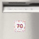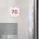 Un aimant pour une fête d'anniversaire 70 ans féminine, comme un cadeau ou un rappel de date pour vos invités. Branches avec des fleurs de magnolia roses, violettes et dorées. Fond blanc élégant. Modèles pour un nom, âge 70 et une date. Date de naissance ou date de la fête/anniversaire. Lettres dorées et bordeaux. Le nom est écrit avec un style de lettrage moderne à la main.