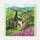 Paysage toscan, coloré, vibrant, beauté expressive de la campagne italienne et champs d'iris violet violet violet, belle flore estivale en vert clair, jaune, marron, bleu, couleurs blanches, prés, champs de fleurs, cyprès et oliviers, ancienne ferme rustique sous le ciel bleu et les nuages blancs.Peinture acrylique sur toile.