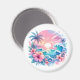 Joli aimant d'oasis tropicale. Magnifique art côtier rose pastel et bleu avec palmiers, fleurs tropicales au coucher du soleil et vagues de l'océan. Joli art tropical pour donner une sensation de plage à votre maison !