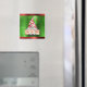 Cet aimant personnalisé sur le thème des fêtes porte un joli gnome de Noël portant un casquette rayé rouge et blanc et portant une pancarte avec les mots "Ho! Ho ! Ho !" sur un faux arrière - plan métallique vert et rouge brillant. Conçu par Susan Coffey.