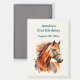Magnet de réservation de date de fête avec une illustration mignonne avec une tête et un corps supérieur de cheval châtain couleur châtaigne brun cuivré. Avec des taches d'aquarelle derrière.