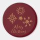 Un aimant avec une illustration de flocons de neige dorés de fantaisie aux formes cristallines élégantes. Un arrière - plan rouge foncé. Le texte dit Joyeux Noël.