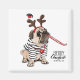Photo Afishka | Shutterstock. ID d'image : 735633319 | Carte de Noël. Carlin Chien dans un cardigan rayé, dans un masque de cerf de corne et avec un rouge drôle de fête siffler soufflant. Illustration du vecteur.