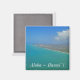 L'aimant Hawaii montre une vue aérienne du littoral hawaïen. Océan et sable se rencontrent sur cette photo.Cet aimant souvenir a aussi le salut traditionnel de l'aloha.