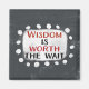 Le texte gras "La sagesse vaut la peine l'attente" est centré sur un arrière - plan gris. Le texte noir et rouge est posé sur un rectangle blanc avec de grands points blancs texturés autour, offrant un contraste ludique sur le fond de couleur solide.