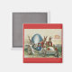 Cet aimant carré de voeux de Pâques a une image vintage de deux lapins dans une voiture blanche antique avec un gros oeuf de Pâques bleu sur un arrière - plan rouge avec le texte de voeux de Pâques.