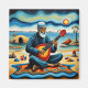 A.I. a créé l'imprimé d'un barbu portant un casquette assis sur un tapis coloré, jouant d'un instrument à cordes Bouzouki sur une plage surréaliste aux motifs vibrants et tourbillonnants. Le paysage présente des formations rocheuses insolites, un soleil éclatant et une mer calme.