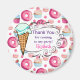 Une fête d'anniversaire customisée et mignonne merci aimnet. Un délicieux délicieux design motif. Des beignets rose vernis avec des arroses. Serviettes d'arrosage à la bouche en rose et bleu avec rosettes et fraises sur le dessus. Des macarons de pâtisserie rose pastel et de petits boutons de bonbons roses décorent également ce motif plein de douceurs. Un cadre fantaisiste dans un style dessiné à la main au centre pour vous permettre de personnaliser avec votre nom. Avec un cône de crème glacée verte à la menthe sur le côté