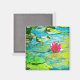 Un nénuphar fuchsia au feuillage vert citron dans une eau turquoise.