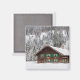 Aimant photo avec une maison cabine traditionnelle en bois rond avec persiennes vertes dans une forêt dans la neige en hiver en Bavière à la frontière entre l'Allemagne et l'Autriche.