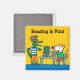 La bibliothèque est tellement amusante ! Maisy et Charley profitent de chaque moment de leur temps à la bibliothèque dans cette illustration de Lucy Cousins tirée de son livre "Maisy Goes to the Library" (publié par Candlewick Press). Les deux amis sont entourés de livres ; Maisy est assis à table, lisant un livre sur le poisson, tandis que Charley balance des livres sur sa tête !
