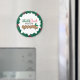 "Mangez, buvez et soyez joyeux" slogan avec des biscuits en forme de coeur en pain d'épices et décoration sainte sur aimant de réfrigérateur de Noël.