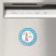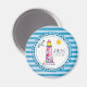 A wedding aimant with nautical theme. Designed on a blue striped pattern and a circulaire nautical frame layered over top. A red striped lighthouse and a beach ball, with a smiling sun and seagull flying off in the distance positionned inside the frame. Personalize with your initials and wedding date.