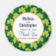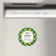 Un aimant mariage avec un motif extensible mignon avec des trèfles vert olive sur un arrière - plan vert foncé. Un cercle blanc avec une fausse bordure en feuille d'or superposée avec votre texte à l'intérieur.