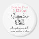 Enregistrer la Date écrite en rose pastel contre arrière - plan blanc. Noms de mariée et de mariée en script noir. Dessins de TamiraZDesigns.