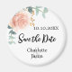 Un aimant Enregistrer la date pour votre mariage. Une arrière - plan blanche design. Décoré d'or rose vert couleur eau et de fleurs roses rousses, rose, eucalyptus feuille, sprigs, verdure, feuilles faux or. Personnalisez et ajoutez la date du mariage et vos noms.