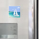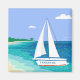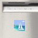 Monogram Sailboat Côtier Tropical Beach Magnet. Un voilier avec votre nom sur elle s'approche d'une plage. Vue sur la mer tropicale. Bleu, turquoise, mousse de mer, turquoise, vert, blanc.