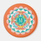 Un mandala doux et pastel, à la motif en turquoise et corail. Artiste : Harriet Sussman