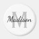 Aimant frigo standard de cuisine ronde en noir et blanc sur mesure en monogramme. Modèle de typographie de script élégant pour nom ou nom de famille. Soirée de fête classique ou idée cadeau pour amis, famille, collègue, clients, employés, clients, visiteurs, invités mariages, etc. Ajoutez votre propre nom d'entreprise en option. Idéal pour Anniversaire, mariage, événement d'entreprise et bien plus encore. Également disponible en forme de carré.