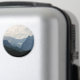 Un aimant avec une photo de belles montagnes, ciel nuageux, et des collines ondulées remplies d'arbres au premier plan. Couleur bleu gris.