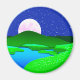 Aimant en illustration circulaire d'une pleine lune qui s'élève au-dessus de collines verdoyantes au bord d'un lac, avec un ciel étoilé bleu nuit