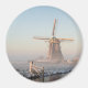Aimant frigorifique rond d'un moulin à vent néerlandais traditionnel couvert de neige dans un paysage rural à Aarlanderveen, les Pays-Bas, en hiver dans la chaude lumière du matin au lever du soleil. Un grand souvenir !