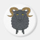 Black Sheep se tient et regarde le spectateur. Pas tout à fait amical avec des paupières baissées, un petit cerceau et une paire impressionnante de cornes.