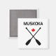Montre deux pagaies de canot croisées, une feuille d'érable canadienne rouge et "Muskoka" ci-dessus. Les avirons et le texte sont noirs. Évoque le grand Canadien à l'extérieur. Conception pour les personnes qui possèdent un chalet à Muskoka et/ou au lac Muskoka, pour les Ontariens, les Canadiens, les touristes américains, les visiteurs. Pour les amateurs de nature, de sports nautiques, de canoë, de kayak, d'aviron, de paddle, de rafting, de voile ou de navigation de plaisance.