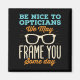 Un cadeau optimiste amusant pour les professionnels de l'optique qui s'adaptent aux lunettes. Design dit, "Soyez gentil avec les opticiens, nous pouvons vous encadrer un jour."
