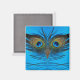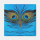 Bird face created from mirrored peacock feather images on a blue metallic background.