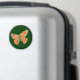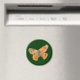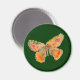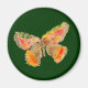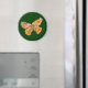 Un aimant circulaire vert profond avec un joli motif papillon en roses et oranges.