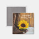 Annoncez vos noces à thème rural ou ranch avec le charme Country Sunflower Western Wedding Save the Date Magnet Carré. Ce mariage rustique et élégant et informel tient l'aimant dateur présente une photo florale pittoresque de bottes de cowboy en cuir marron, de fleurs de tournesol jaune et de bois de grange brun sur satin blanc.