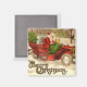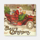 Aimant frigo carré vintage : santa claus crus dans la vieille voiture pleine de jouets à travers la neige