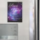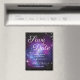Jolie galaxie violet grappes photo avec un sauver l'invitation de date avec un style calligraphie charmant. Les couleurs principales sont le violet, le bleu, la lavande et le noir avec le blanc. Un petit aimant photo rectangulaire pour sauvegarder les dates.