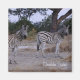 Les impressions photo et les cadeaux de Double Take Zebras Nature présentent une belle photographie de deux zèbres regardant tous deux le spectateur, prise lors d'une pause par Kurt Keller avec un appareil photo 35 mm lors d'un safari en Afrique au Botswana, en Afrique du Sud et au Zimbabwe. Chaque zèbre est unique et porte son propre motif de rayures malgré le double regard. Quiconque aime les animaux africains, la faune et les amateurs de zèbres apprécieront cette belle photo de deux zèbres debout dans la savane.