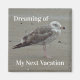 "Dreaming of My Next Vacation" est le sentiment sur cet aimant de plage amoureux. Cet aimant frigo affiche l'image d'une mouette gris solitaire posée sur le sable plat. De petits galets et de minuscules coquillages sont visibles sur la plage. "Dreaming of My Next Vacation" peut être facilement customisé si vous le désirez.