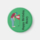Un golfeur vert personnalisé, portant un casquette, une chemise rouge profonde et un pantalon bleu, mettant une balle de golf dans un aimant de trou.