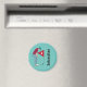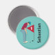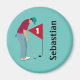 Un golfeur bleu personnalisé, portant un casquette, une chemise rouge profonde et un pantalon bleu, mettant une balle de golf dans un aimant de trou. Customisez le texte.