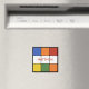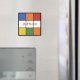 Ce design géométrique simple de carré dans des couleurs primaires vives d'orange, bleu, rouge, vert, jaune et blanc dressé contre un arrière - plan noir a une atmosphère rétro des années 1980. Ajoutez votre propre nom ou autre texte pour créer votre propre aimant frigo carré personnalisé. Fait un grand petit cadeau ou rembourrage.
