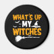 Ce design présente un texte orange et blanc "What's up my witches" dans la typographie populaire avec chauves-souris, un casquette de sorcières, broomstick et araignée comme décoration. Un cadeau parfait pour Halloween. #halloween #fête #cuisine #aimant #sorcière #paroles #fêtes