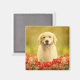Un Golden Retriever au soleil et aux fleurs rouges.