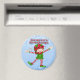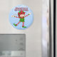 Bonnes Fêtes Elf Round Magnet dispose d'un arrière - plan bleu clair avec des tourbillons et des flocons de neige, un Happy Père Noël Elf en rouge et vert, tenant un sucre de canne coloré. Le texte rayé rouge stylisé est une Bonnes Fêtes. Un cadeau parfait pour le rembourrage de Noël! Cette conception a été créée à l'aide de artwork©delightful-doodles.com (http://delightful-doodles.com/) original