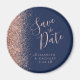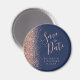 Le bord gauche de cet élégant aimant Save the Date comporte une bordure de parties scintillant en or rose. Le texte personnalisable combine écriture manuscrite rose rose avec police serif sur un arrière - plan bleu marine.