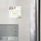 Cet aimant frigo amusant facilitera la mémoire de vos invités de la date de votre prochain mariage. L'élégant texte en or dit : Enregistrer la Date avec les noms du couple et la date du mariage. Le joli design comprend des bouquets de fleurs printanières dans chaque coin avec des roses roses roses, hydrangée violette, orchidées blanches et lys calla.