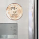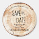 Personnalisez ce mariage unique Enregistrer la Date cercle magnets. Il est doté d'un disque imprimé de bois coupé et d'une typographie fantaisiste parfaite pour votre mariage rustique.