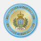 Le manteau national des armoiries de la micro-État, Saint-Marin, est infusé au centre d'un faux cercle d'or. Autour de cette image, sont les noms officiels du pays, en italien et en anglais.