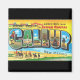 Carte postale vintage pour Gallup, Nouveau-Mexique. Sur la route 66, cette ville du nord-ouest du Nouveau-Mexique compte plus de 100 postes de traite et abrite les Indiens Hopi et Zuni. L'illustration sur cette carte est brillante et joyeuse avec de l'or, du bleu et du vert. Il dispose d'un wagon-train et de plusieurs scènes amérindiennes.